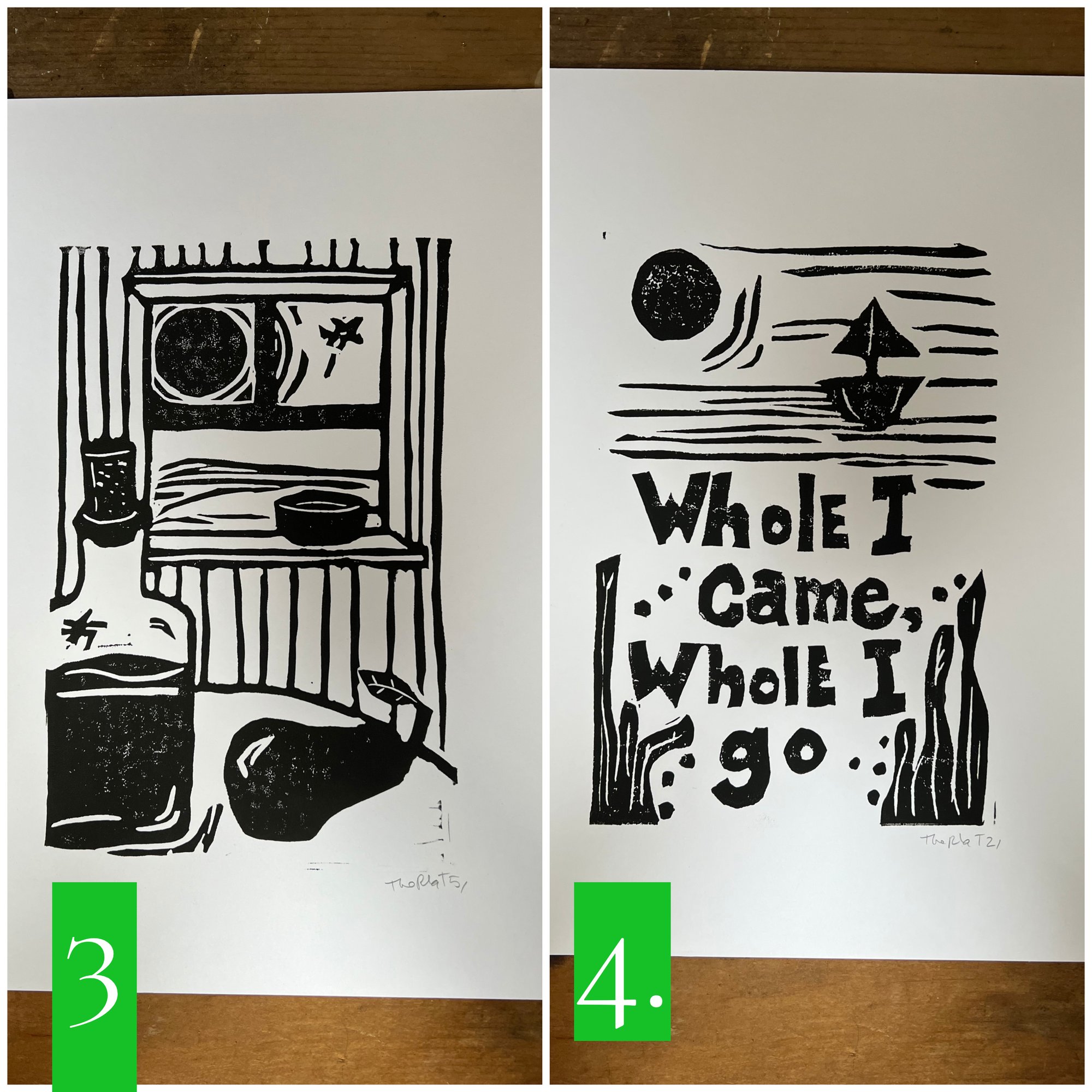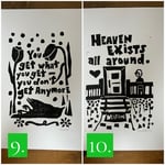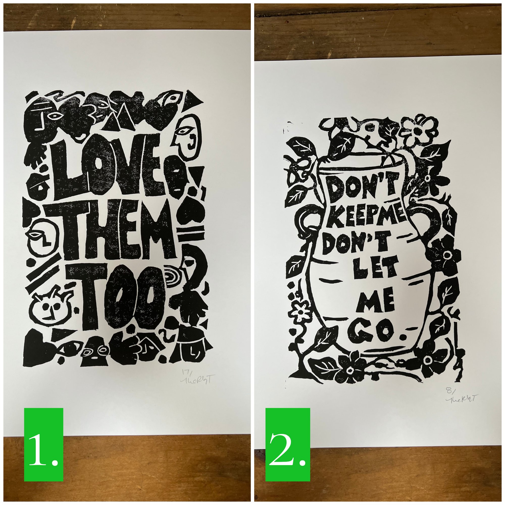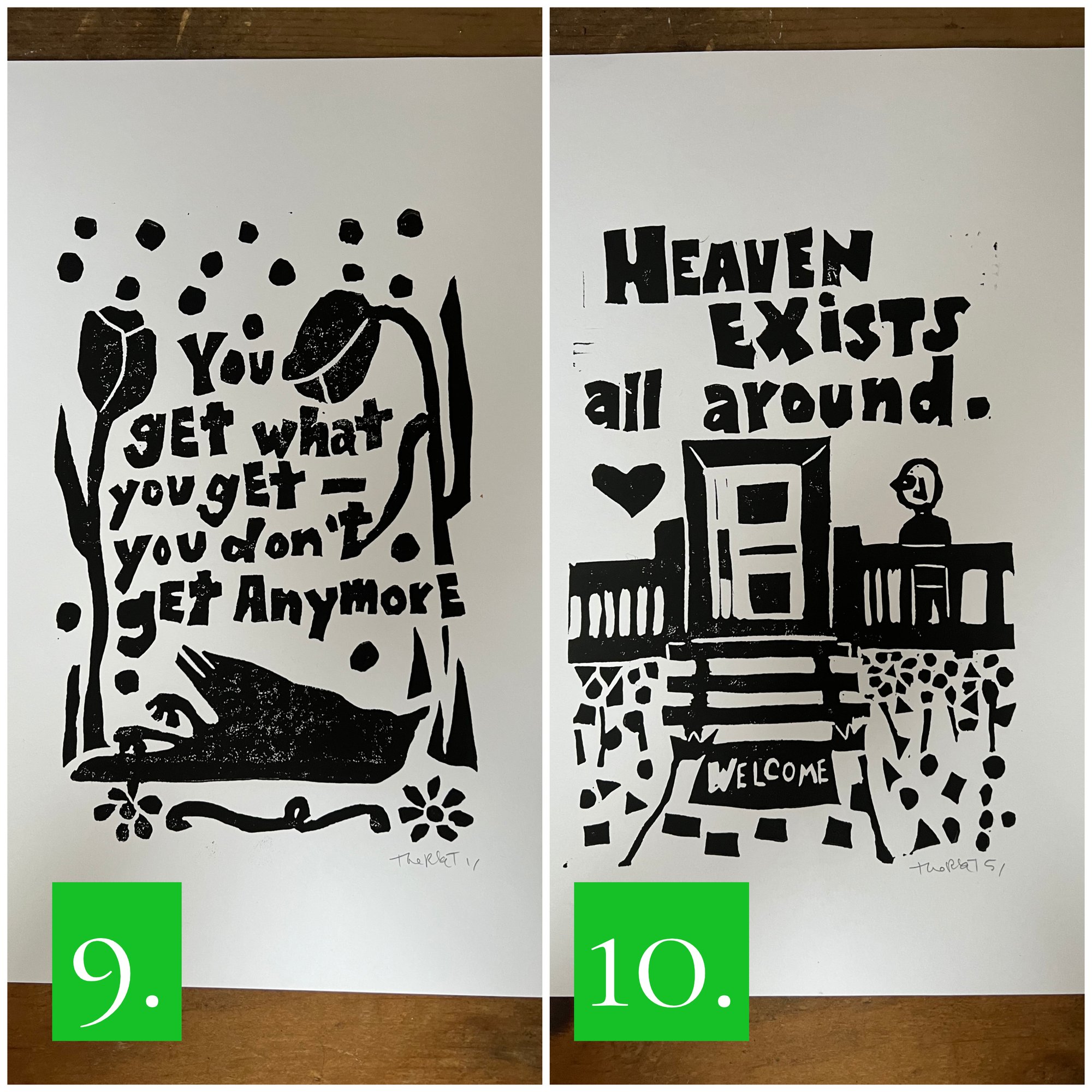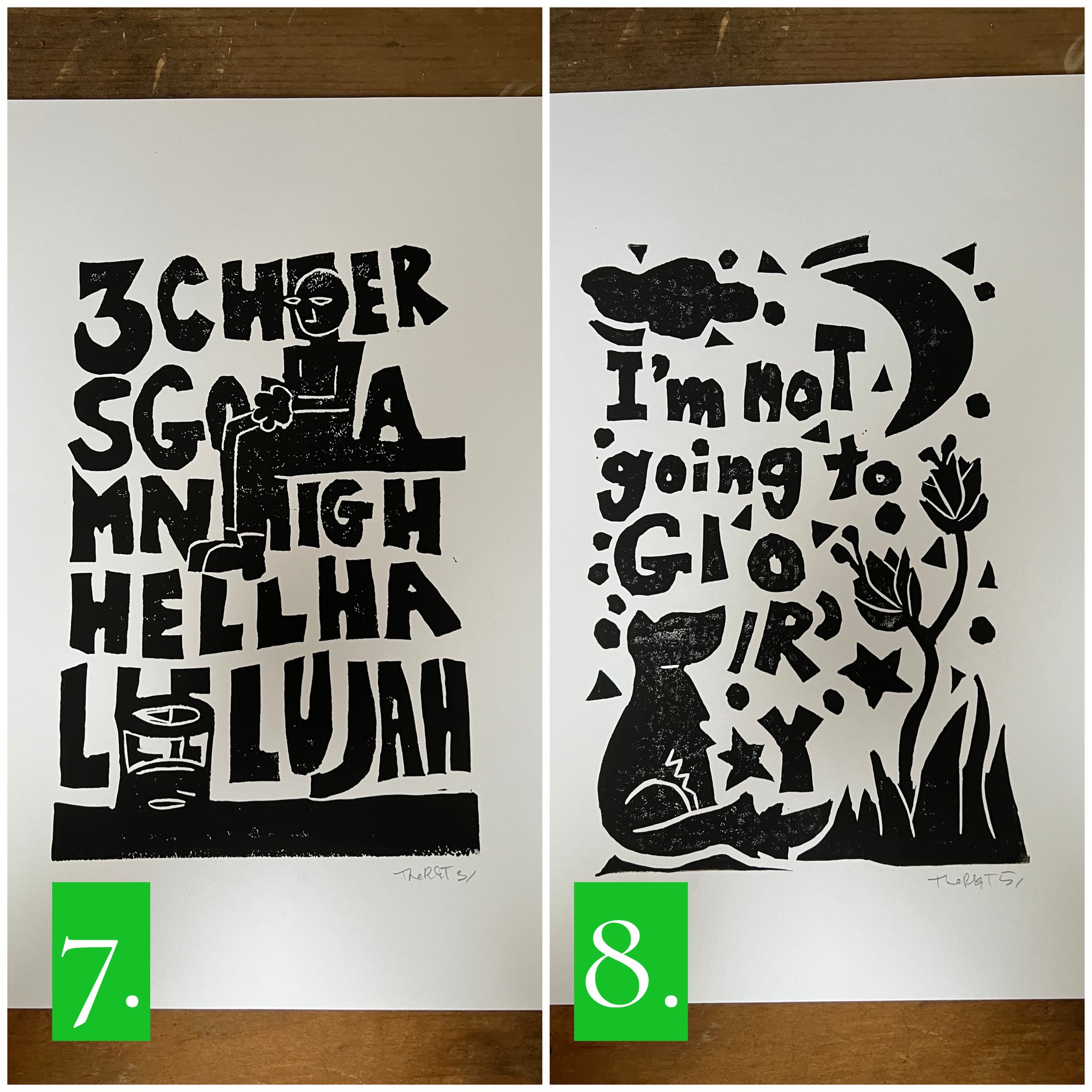We created an image for each song from Hymns For My Atheist Sister & Her Friends To Sing Along To. Each drawn by Mallory, transferred and carved then printed by hand by Scott. Previously only sold at live shows, we're finally putting them up here on the shop! White paper, black ink, 11"X14". Snag the one that suits you best, or collect all 10 (while they last). They'll be going back to live show only after the holiday season!