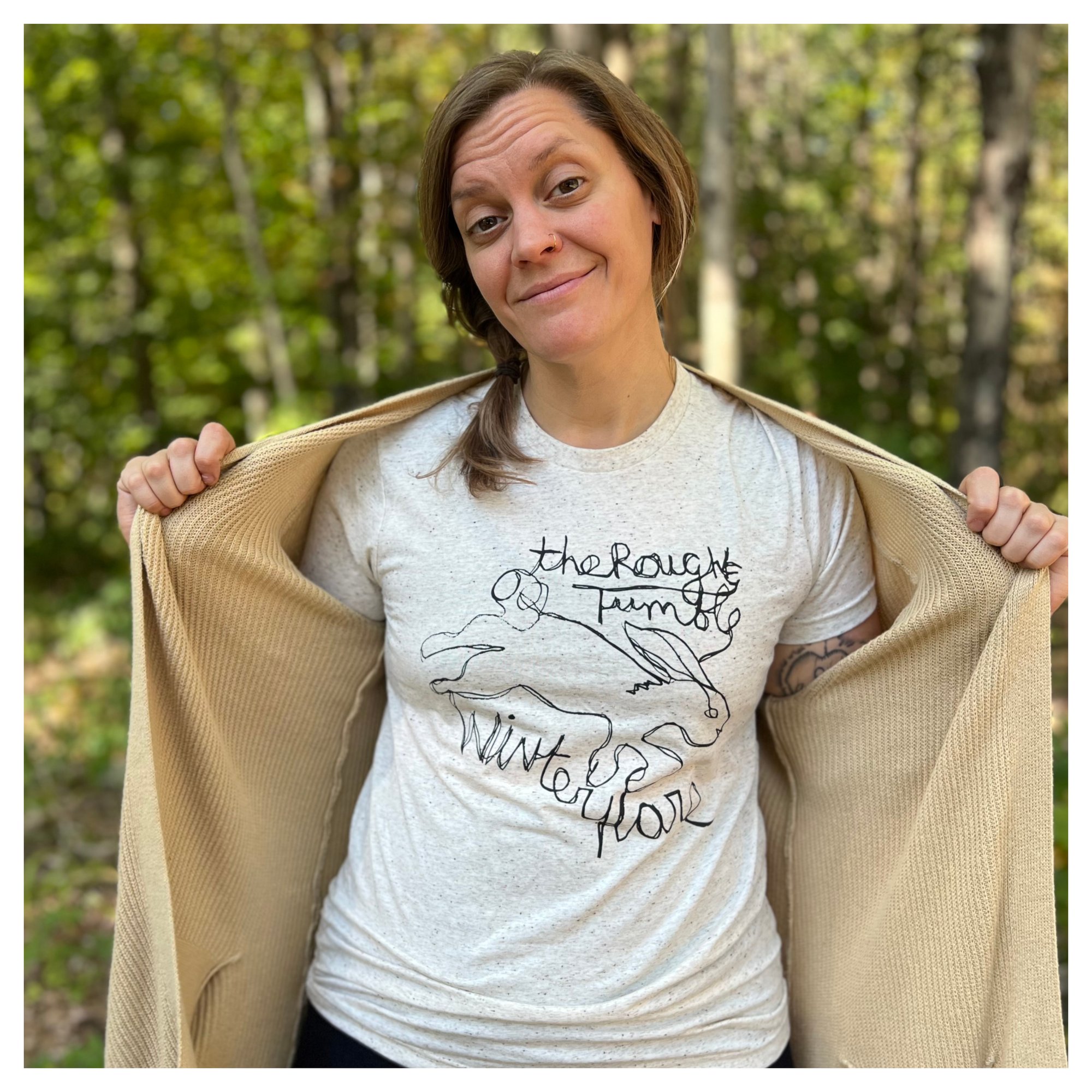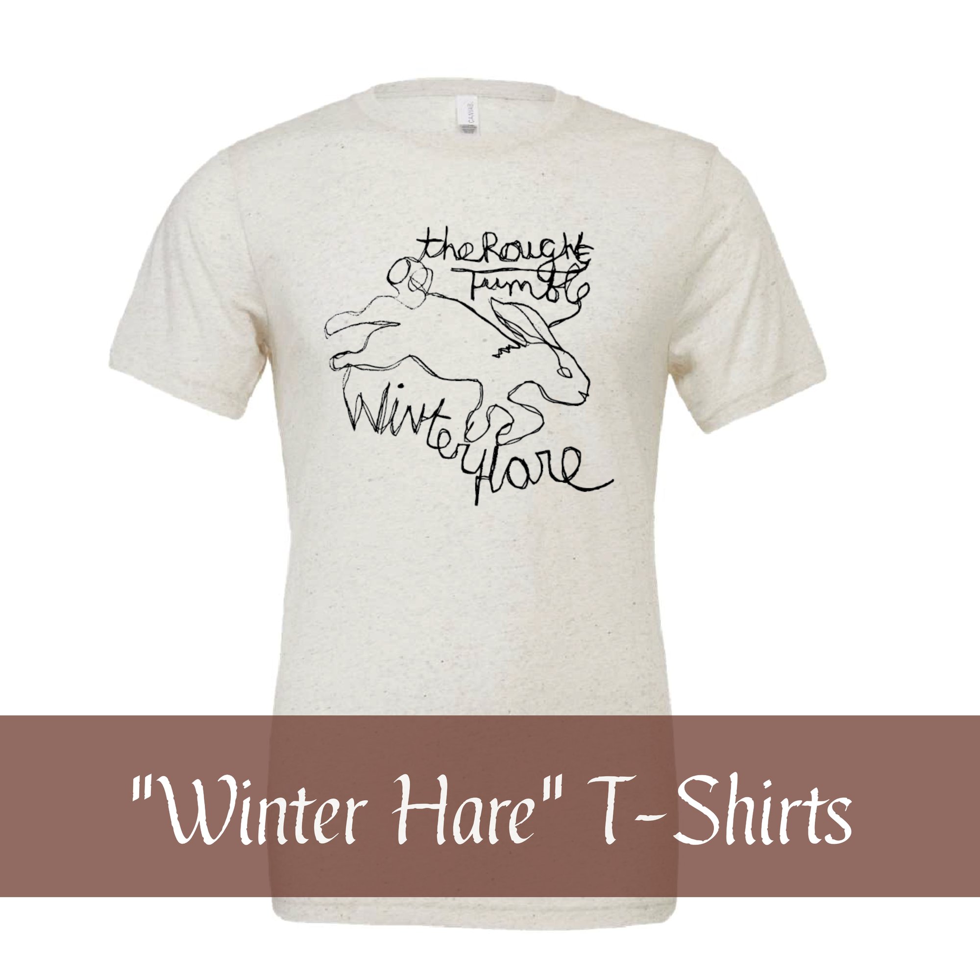 Designed by us, blind contour drawing of a winter hare. Printed by MerchInk in Nashville.